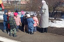 Воспитанники группы "Капельки" с интересном наблюдают за природными изменениями весной на целевой прогулке.