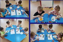 В первой младшей группе "Зайчики", продолжаем закреплять умение правильно держать кисть, набирать краску на ворс, промывать кисть. Учить различать и называть цвета. Учить украшать изделие полосками, развивать воображение.