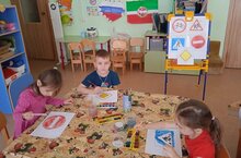 Ребята группы "Солнышко"рассмотрели сюжетные картины на тему:" Соблюдай правила дорожного движения ".Поговорили о дорожных знаках, какие они увидели на картинах, к каким группам они относятся: запрещающие, предупреждающие, знаки приоритета. Закрепили полученные знания в рисунках.