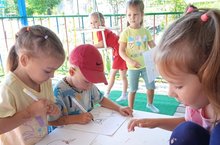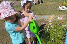 Лето- самое замечательное время для прогулок, различных игр. Игры с песком очень увлекают, дети создают свои постройки:замки, фигурки. В жаркую погоду хочется побыть в тени. На веранде все условия для этого. Спасибо большое родителям за приобретённые стол со стульями, качелю и т.д. Можно посидеть, порисовать, собирать лего. Также с помощью родителей были высажены клумбы, которые радуют глаз. Ребята с удовольствием вместе с воспитателем поливают их.