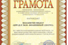 Поздравляем коллектив детского сада с получением грамоты за 2 место в муниципальном рейтинге " За высокое качество образования" среди дошкольных образовательных учреждений.