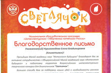 Благодарственное письмо Национальной образовательной программы "Интеллектуально-творческий потенциал России" получила воспитатель Нуриахмедова Елена Владимировна. Президиум Малой академии наук "Интеллект будущего" благодарит за активное сотрудничество и подготовку лауреатов Всероссийскогго интеллектуально-творческого конкурса для дошкольников "Светлячок".
