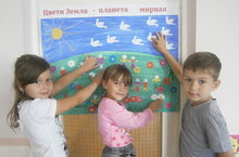 В ходе реализации проекта «Земля – наш общий дом» в подготовительной к школе группе №47 «Пчёлка» была проведена огромная работа по воспитанию экологической культуры у детей. Итогом этой работы стало выполнение коллективной аппликации на тему «Цвети земля – планета мирная». В результате творческой деятельности детей и педагогов появилось прекрасное панно, которое порадовало и детей, и взрослых. Создавая этот плакат, дети с удовольствием вырезали силуэты красивых голубей и весёлых человечков, складывали из бумаги разноцветные цветы, проявляя при этом фантазию и творчество, вкладывая любовь в каждую поделку и получая радость от общения друг с другом.