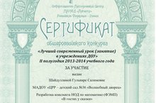 Шайдуллину Гульнару Салимовну поздравляем с получением сертификата общероссийского конкурса "Лучший современный урок (занятие) в учреждениях ДОУ" за разработку конспекта НОД по ФЭМП "В гостях у сказки". МОЛОДЕЦ!