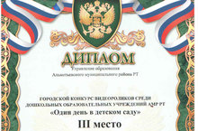 Поздравляем коллектив нашего детского сада с получением диплома победителя (III степени) городского конкурса видеороликов среди ДОУ АМР РТ "Один день в детском саду". Молодцы!