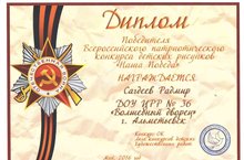 Диплом победителя Всероссийского патриотического конкурса детских рисунков "Наша Победа" награждён Сагдеев Радмир, воспитанник группы "Пчёлка". Благодарственное письмо Лига конкурсов детских художественных работ "Конкурс - ОК" за участие в этом конкурсе прислано нашему детскому саду.