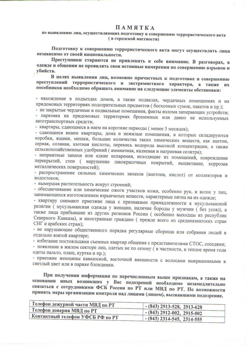 Памятка по выявлению лиц, осуществляющих подготовку к совершению террористического акта