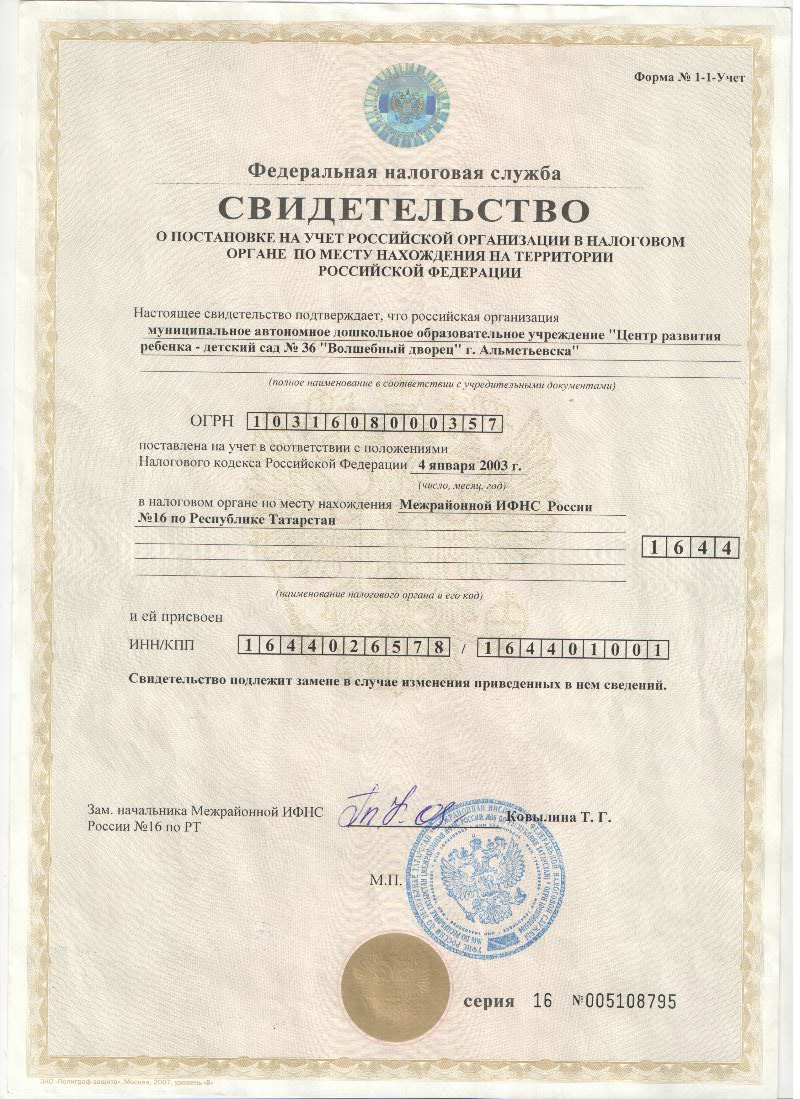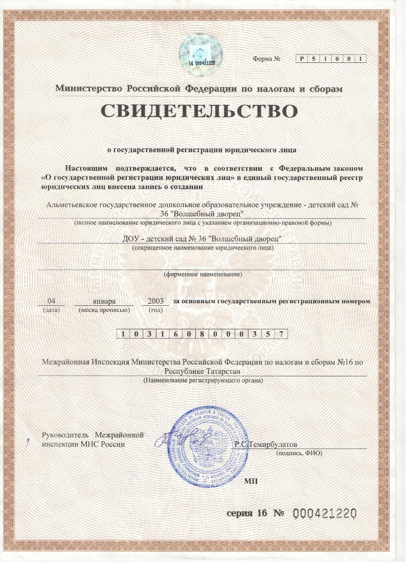 Свидительство о внесении записи в Единый государственный реестр юридического лица