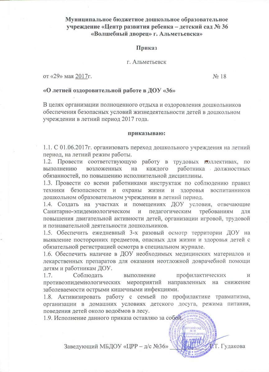 Приказ о летней оздоровительной работе в ДОУ №36