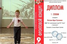 Поздравляем воспитанника подготовительной к школе группы N 4 Фаттахова Мурата. Диплом I степени, Фестиваль детского творчества, Фронтовой концерт к 9 мая. Желаем продолжать добиваться успехов, никогда не останавливаться на полпути.