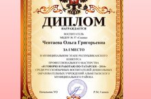 Поздравляем Чентаеву Ольгу Григорьевну с заслуженной победой - Диплом за ПЕРВОЕ место в муниципальном этапе республиканского конкурса профессионального мастерства "Я говорю и работаю по-татарски" среди русскоязычных воспитателей ДОУ АМР