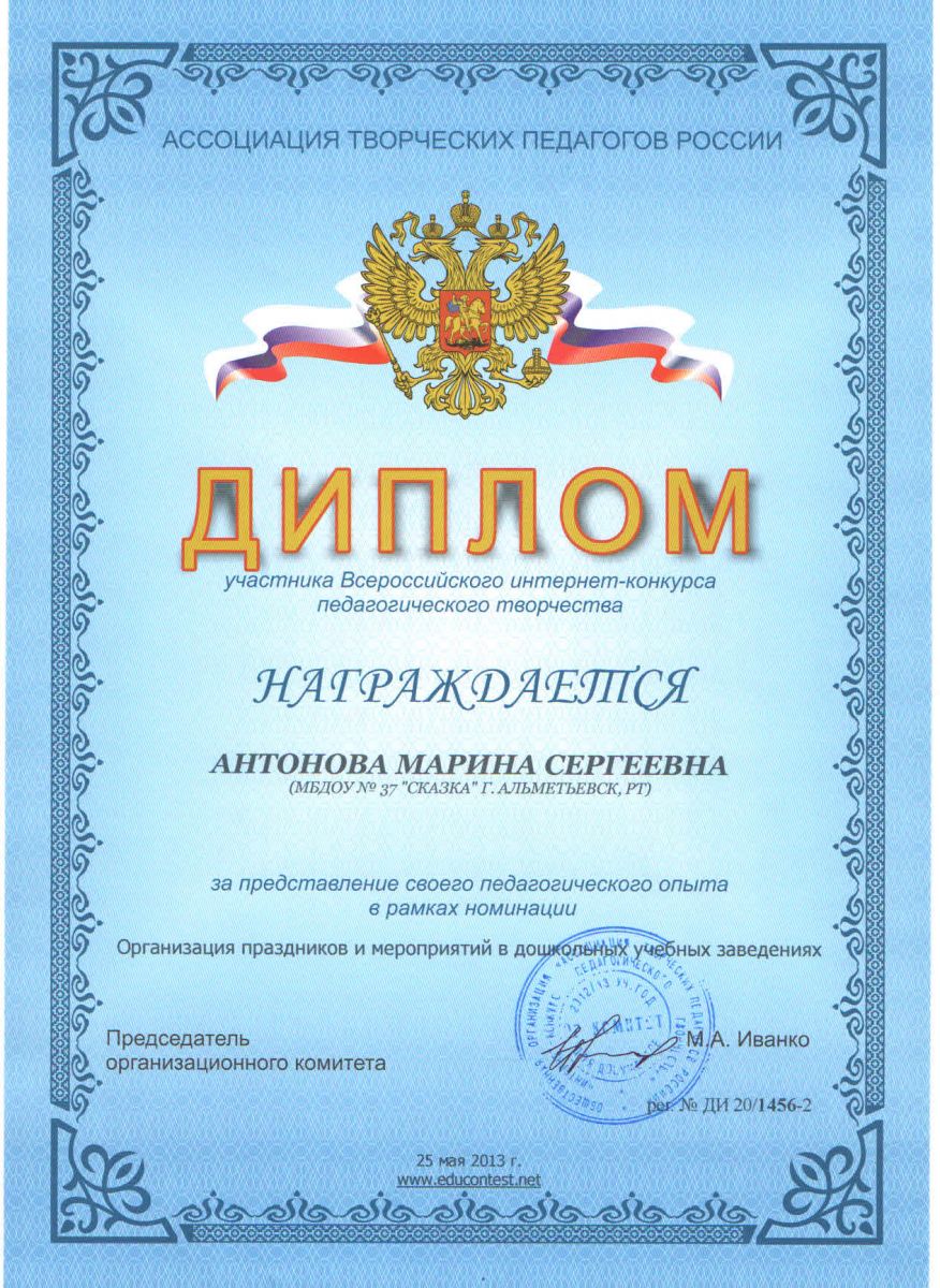 Диплом участника интернет-конкурса педагогического творчества Антоновой М.С.