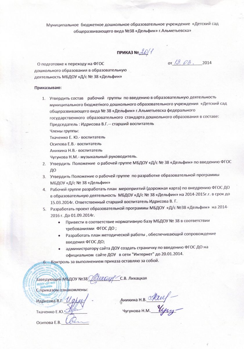 Приказ об организации деятельности МБДОУ "Д\сад №38 по подготовке к введению ФГОС ДО"