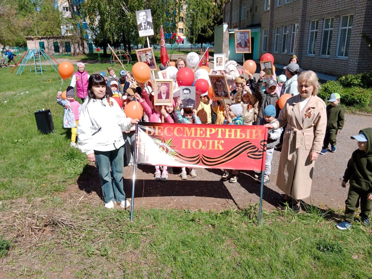 В преддверии Великого праздника – Дня Победы воспитанники, родители, педагоги и сотрудники ответственно подготовились к мероприятию: в руках у участников шествия – фотографии родственников, внесших вклад в Великую Победу, шары, флажки. Многие дети были в военной форме и пилотках, а на грудь все с гордостью прикрепили символ Победы – георгиевские ленты.