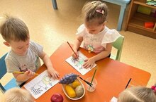 . Рассматривали картинки с их изображениями. В завершении занятия с помощью цветных карандашей малыши раскрассили свои "Витаминки на тарелке".