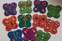 Работа проводилась в несколько этапов. Сначала ребята размазывали пластилин на картоне, потом окрашивали скорлупу гуашью и затем украшали бабочек.Фото.