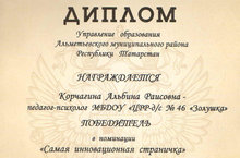 Приглашаем всех желающих на страничку педагога-психолога на официальном сайте МБДОУ "ЦРР-д/с №46 "Золушка", ставшую победителем в муниципальном конкурсе "Лучшая страничка педагога-психолога на сайте ДОУ" среди педагогов-психологов ДОУ АМР РТ в номинации "Самая инновационная страничка".
