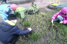 Предпраздничная первомайская неделя в МБДОУ № 48 "Веснянка" завершилась акцией экологического содержания "Первоцветы". Дети рыхлили почву вокруг ландышей, помогали пробиться сквозь асфальт мать-мачехе, искали первоцветы, опираясь на наглядное их изображение.