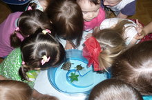 Н.Ю. Шамсуллина (мама Тимура) проявляет активную позицию в этом сотрудничестве. Сегодня она принесла трёх черепашек. Совместно с воспитателем Махьяновой Е.В., дети наблюдали за поведением черепашек на воде. Дети были в восторге.
