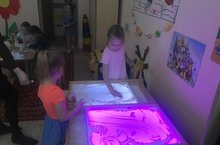 Занятия выравнивают эмоциональное состояние ребёнка, развивают детскую способность к самовыражению и творческому восприятию мира. На итоговом занятие кружка "Волшебный песок" дети совершили увлекательное путешествие, отправившись в удивительный и непредсказуемый "Подводный мир", попробовав разгадать его тайны. Познакомились с его жителями, посмотрели как необычен подводный мир, построили "Замок из песка". Создавая свой неповторимый мир на песке с помощью разнообразных фигурок, малыш передаёт нам все свои фантазии и переживания. -