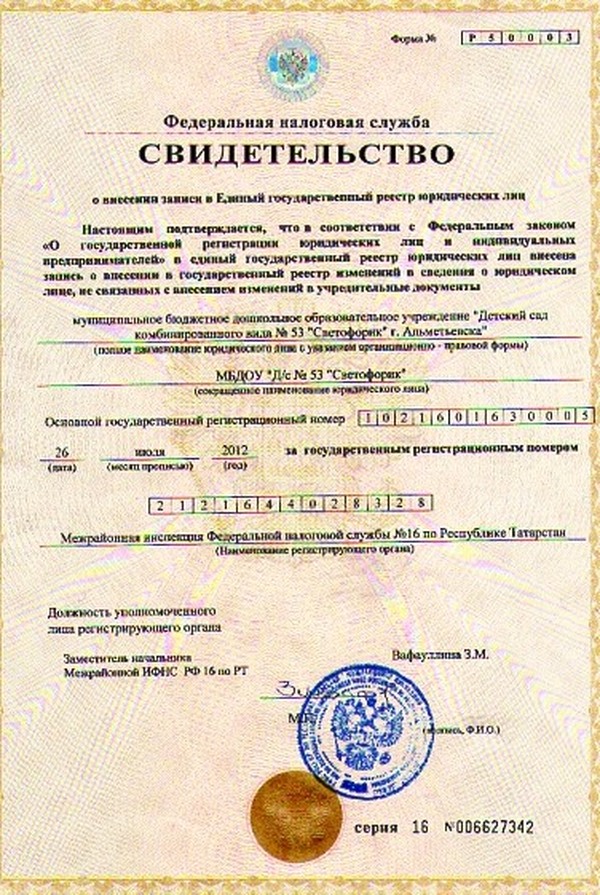 ОГРЮ (Свидетельство о внесении записи в Единый государственный реестр юридических лиц)
