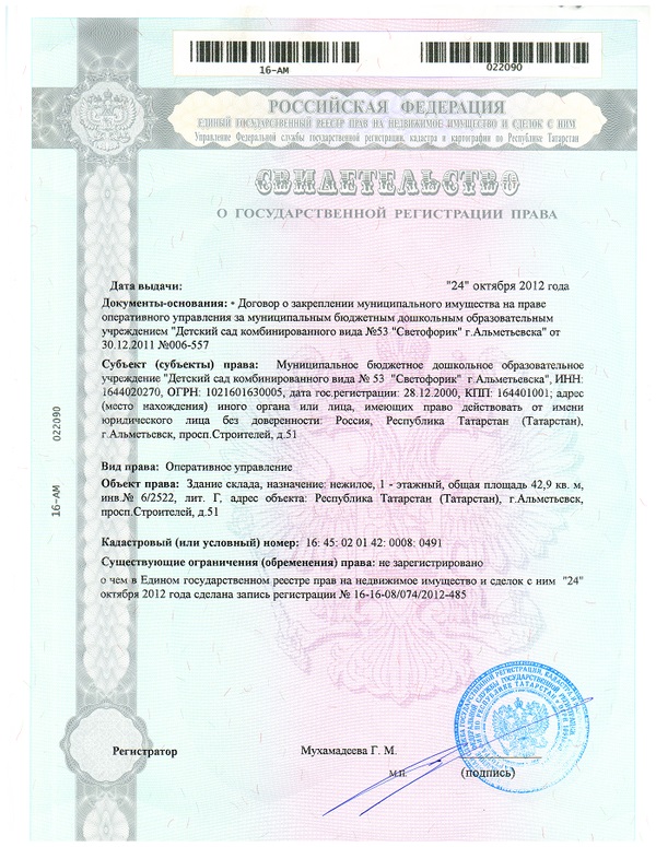 Свидетельство здания детского сада