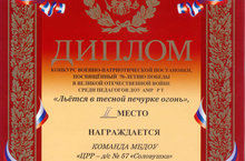 Поздравляем педагогический коллектив ДОУ, занявшее II место в конкурсе военно-патриотической постановки «Льётся в тесной печурке – огонь» среди педагогов ДОУ № 44, 52, 57, 65.