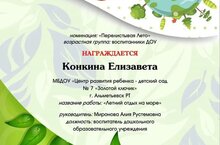 Поздравляем Конкину Елизавету, воспитанницу подготовительной к школе группы № 1 (воспитатель Миронова А. Р.) с победой в Республиканском конкурсе творческих работ среди воспитанников образовательных организаций "Природа - наш дом". Она заняла 2 место.