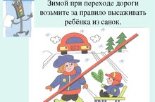 Переходя через дорогу, соблюдайте правила дорожного движения, не переходите улицу и не перебегайте перед близко идущим транспортом. ПОМНИТЕ - проезжая часть скользкая и торможение транспорта затруднено, возможны заносы.При наличии светофора - переходите только на зеленый свет. так как ребенок в дальнейшем копирует все ваши действия. В гололед выбирайте более безопасный маршрут и выходите из дома заблаговременно.