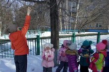 По календарю весна, а на улице самая настоящая зима с пушистым снегом, метелью и ночными морозами. Зима была не холодная, и не очень снежная, для птиц в лесу хватало корма, но вместо весенних солнечных деньков, вдруг закружило, замело, подморозило, и зимующие, кочующие птицы прилетели ближе к людям, в город. Стайки свиристелей, снегирей, синиц, ну и конечно же воробьи, голуби слетаются на деревьях возле домов, на территории парков, скверов, детских садов и школ. И кому, как не нам нужно позаботиться об их пропитании. Наши дошколята с большим удовольствием пополняют запасы корма (хлебные крошки, семечки) в кормушках, развешанных на территории детского сада с самого начала зимы. Но птицам также как и нам хочется чего-нибудь вкусненького, так подумали воспитанники старшей группы «Почемучки» детского сада №34 «Чебурашка». Под руководством воспитателя Аркаевой Татьяны Владимировны, дошколята решили приготовить необычную сладость для птиц. Из бросового материала сделали трубочки, которые обмакнули сначала в мучной клейстер, а затем обсыпали семечками, крупой, птичьим кормом. Трубочки развесили на веточках кустарников и деревьев на своем участке. Затаив дыхание, наблюдали, как первая синичка пожаловала в необычную столовую, и с большим удовольствием отведала вкусное угощение. А за первой синичкой прилетят и другие, всем хватит, а кончится угощение – еще сделают наши воспитанники, в беде пернатых не оставят