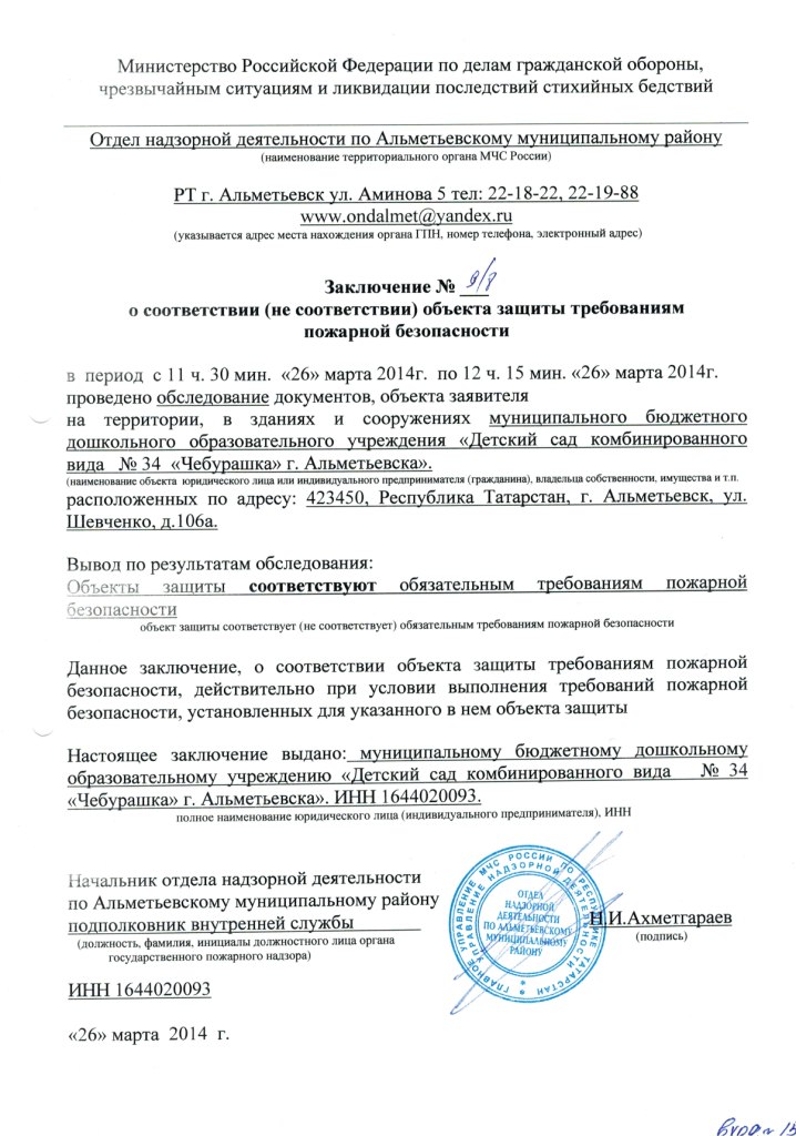 Заключение о соответствии объекта защиты требованиям пожарной безопасности