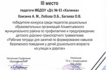 Поздравляем педагогов нашего детского сада : Хамзину А.М., Лобову О.Б., Багаеву О.В., занявшие 3 место в городском конкурсе среди педагогов ДОУ АМР РТ по профилактике и предупреждению детского дорожно-транспортного травматизма "Рабочие тетради для занятий по формированию навыков безопасного поведения у детей дошкольного возраста на улицах и дорогах".