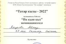 Сегодня на базе детского сада № 47 “Энже бортеге” г.Альметьевска прошел муниципальный конкурс "Татар кызы-2022". Воспитанница старшей группы 1 Якупова Айназ была награждена Дипломом в номинации "Иң кыю кыз". Огромное спасибо воспитателю по изучению татарского языка Хасаншиной Г.М., подготовившая воспитанницу к конкурсу. Так держать!