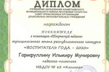 Коллектив детского сада № 63 "Калинка" поздравляет педагога-психолога Гарифуллину И.М., победителя в номинации "Творческий педагог" в муниципальном этапе республиканского конкурса "Воспитатель года-2020" .