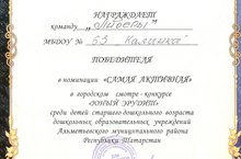Поздравляем команду "ЛИДЕРЫ" (воспитанников подг.группы №1: Аверьянову П., Каримова М., Фарукшину Т.), награжденную Дипломом в номинации "Самая активная" в городском смотре-конкурсе "Юный Эрудит" среди детей старшего дошкольного возраста ДОУ АМР РТ. А также особая благодарность воспитателям: Билаловой А.А., Газетдиновой В.Н., подготовивших детей к конкурсу.