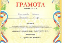 Поздравляем воспитателя детского сада № 63 "Калинка" пгт.Нижняя Мактама Кошманову Евгению Ринатовну, победителя муниципального этапа V Республиканского конкурса профессионального мастерства русскоязычных воспитателей "Я говорю и работаю на татарском -2018" в номинации "Творческий педагог". Огромное спасибо воспитанницам подготовительных групп, участвующих в танце "Чак-чак", а также их родителям.