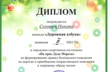 Поздравляем воспитанника подготовительной группы №1 Соловьева Никиту , участника команды дошкольников г. Альметьевска "Дорожная азбука", занявшая призовое 2 место в городском спортивном состязании "На приз Деда Мороза". Так держать!