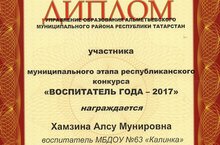 Поздравляем воспитателя МБДОУ "Д/с № 63 "Калинка" Хамзину Алсу Мунировну -участницу муниципального этапа республиканского конкурса "Воспитатель года -2017".