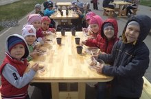 Детей встретили воспитанники кадетской школы. Детям показали и рассказали о военной технике. Полевая кухня угостила детей кашей.