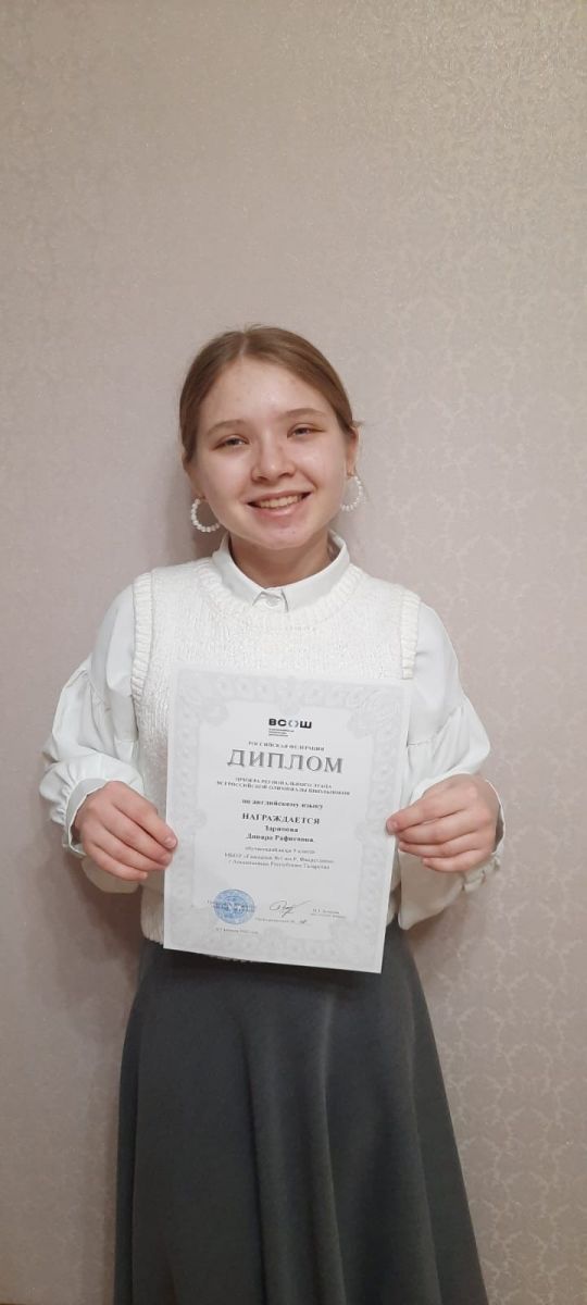 Зарипова Динара стала призёром регионального этапа ВОШ по английскому языку! Молодец! Самые тёплые поздравления в адрес Динары, учителей Айгуль Мизхатовны и Нафисы Фоатовны, в адрес мамы! Это общая победа!!!!
