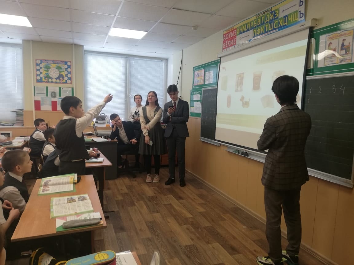 Ученики 11 Б и 9 В класса провели экологический урок "Отходам вторую жизнь" учащимся 3 Б класса.