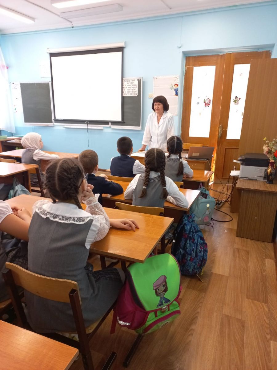 4б сыйныф укучыларының шәфкать туташы Рамилә Габдрахман кызы белән очрашуы .Ул балаларга үз сәламәтлеге өчен җаваплылык һәм авыруларны профилактикалау алымнары турында сөйләде.