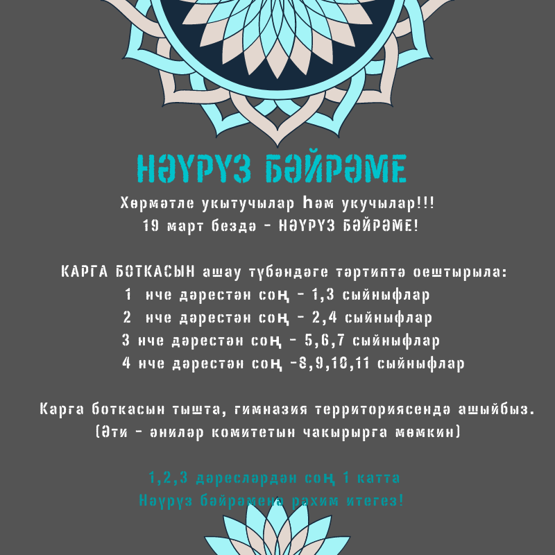 Көннең төнне куып җиткән вакытында, кыш бабабызның чәчләре кар сулары булып ага башлагач, әби- бабаларыбыз – Язны-Нәүрүзбикәне каршылаганнар.Буген бакчабызда Нэуруз бэйрэмен уткэрдек. Балалар матур теләкләрен эйтеп Нәүрүзне чакырып биюлэр биеделэр, шигырьлэр сэйлэ… -