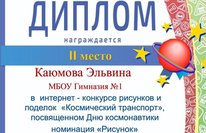 Наша ученица заняла 2 место за участие в интернет-конкурсе рисунков и поделок "Космический транспорт", посвященный Дню космонавтики в номинации Рисунков