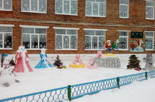 Герои сказки "Три поросенка" и новогодние персонажи из снега