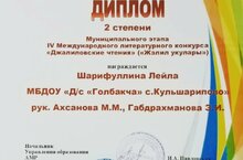 Наша воспитанница старшей группы Шарифуллина Лейла награждена дипломом 2 степени в IV Международном литературном конкурсе "Джалиловские чтения" ("Жэлил укулары"). От всей души поздравляем!!!