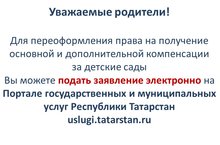 Для переоформления права на получение основной и дополнительной компенсации за детские сады Вы можете подать заявление электронно на Портале государственных и муниципальных услуг Республики Татарстан uslugi.tatarstan.ru 01.07.2017