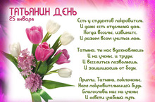 Татьянин день, Татьянин день, Еще не радует сирень, Еще во всю лежат снега, Еще за окнами пурга, Но январю уже пора Готовить сани со двора. И на престол спешит февраль, Пронзая свистом ветра даль. Пойди к Татьяне и скажи Слова от сердца от души, Поздравь ее и пожелай Счастливых дней и долгих лет, Чтоб радость била через край, И сбылся свет благих примет.