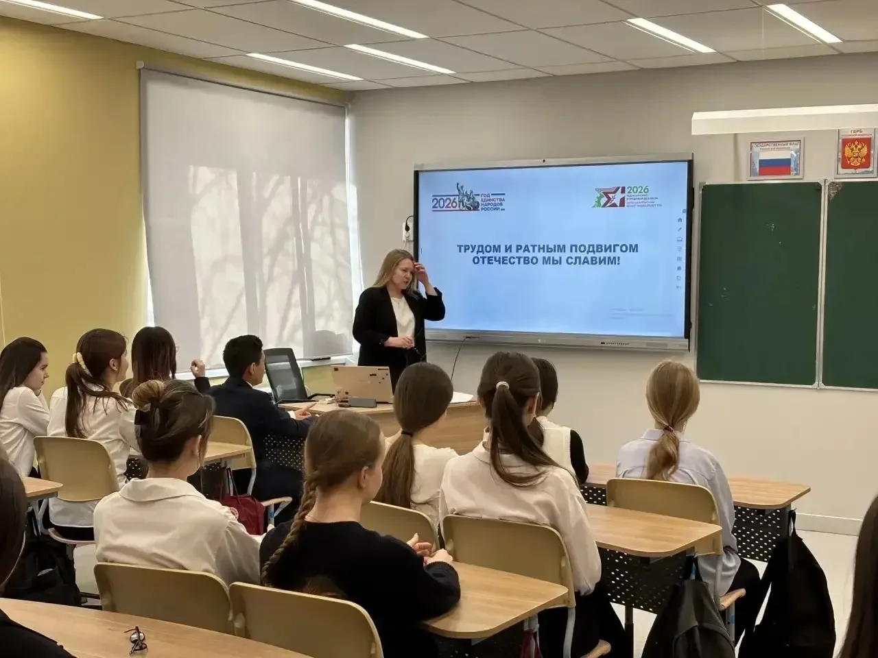 В центре обсуждения была связь поколений. Ребятам рассказали о том, что героизм – это не всегда на поле боя. Это и невероятный трудовой подвиг в тылу в годы Великой Отечественной войны и мужество тех, кто сегодня защищает интересы нашей Родины. В ходе урока прослушали выступление Рахмановой Адели, ученицы 10 «Б» класса, она рассказала о ратном и трудовом подвиге своего прадеда. Говоря о героях настоящего времени прослушали выступление ученика 8 «Б» класса Галяува Ранеля о родственниках, погибших в ходе СВО. Анастасия Николаевна рассказала о работе волонтерского штаба и о важности той помощи, которая оказывается фронту, о ценности писем, которые дети пишут солдатам.