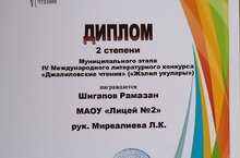 18.10-10.11 гә кадәр “Җәлил укулары" IV Халыкара әдәби шигырь укучылар бәйгесенең муниципаль этабы булып узды. Әлеге бәйгенең максаты – М. Җәлилнең иҗади мирасын популярлаштыру; укучыларның иҗади сәләтләрен үстерү өчен шартлар тудыру; әдәби шигъри юнәлешләргә уңай эмоциональ караш тәрбияләү. 6 нчы Г сыйныфы укучысы Шиһапов Рамазан М.Җәлилнең “Кызыл ромашка” шигырен сәнгатьле укуда катнашып, 2 нче урынны яулады. Рамазанны бәйгегә әзерләгән туган (татар теле) тел һәм әдәбияты укытучысы Мирвәлиева Л.К.га, Шиһапов Рамазанга алга таба тагын да югарырак үрләр яуларга дигән теләктә калабыз!